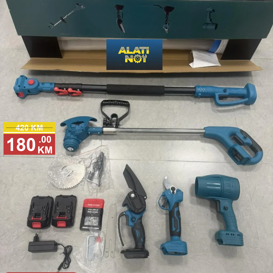 5u1 multifunkcionalni aku vrtni set – teleskopska pila, vrtne makaze, mini lančana pila, duvač + 2 baterije i punjač